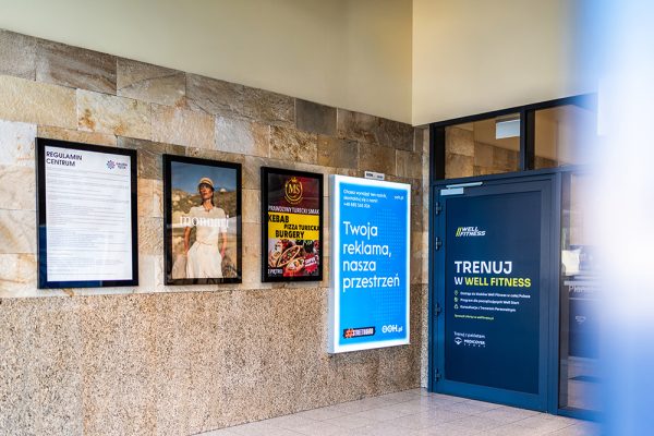 Widoczna forma komunikacji umieszczona przy głównym wejściu do obiektu. Plakat w ramie pozwala skutecznie zaprezentować ofertę lub komunikat reklamowy wszystkim klientom wchodzącym do centrum.