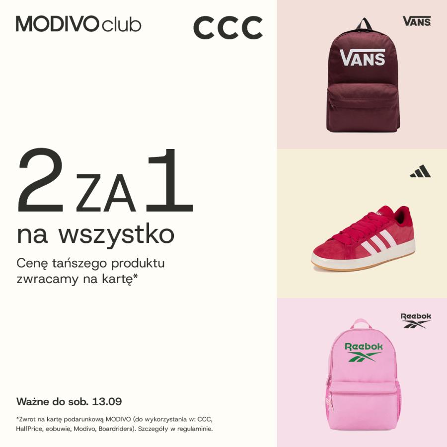 Rok szkolny tuż, tuż, a może planujesz jeszcze letnie eskapady? Niezależnie od okazji, CCC ma dla Ciebie superofertę! Skorzystaj z promocji 2 za 1 na wszystkie produkty! Otrzymasz zwrot za drugi, tańszy artykuł na Kartę Podarunkową MODIVO. To idealny moment, by uzupełnić braki w garderobie, przygotować się na nadchodzący rok szkolny, czy po prostu sprawić sobie coś nowego. Nie przegap tej szansy na udane zakupy!