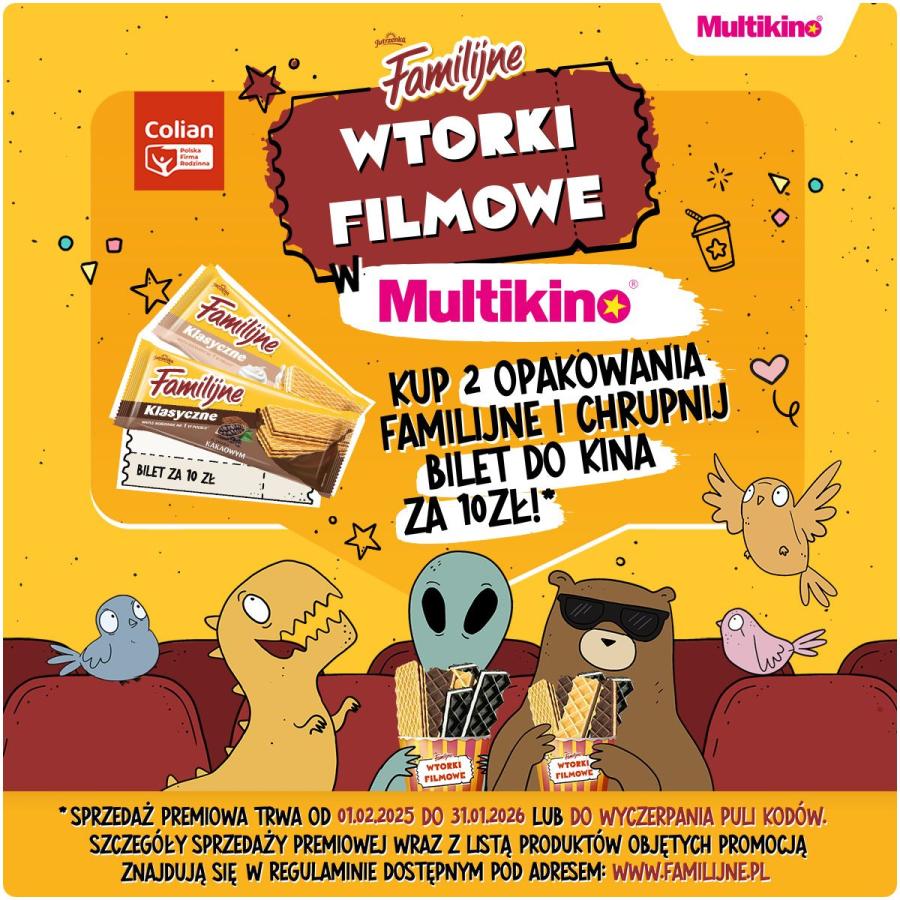 „Familijne wtorki filmowe” to doskonała okazja do tego, żeby zapomnieć o jesienne aurze i wybrać się do kina na najnowsze filmowe premiery w bardzo korzystnej cenie. W celu skorzystania z promocji wystarczy zakupić jeden z produktów marki Familijne na przykład: Familijne wafle klasyczne o smaku śmietankowym lub Familijne wafle gofrowe o smaku czekoladowym. Następnie na stronie familijne.pl należy wypełnić zamieszczony formularz zgłoszeniowy załączając między innymi dowód zakupu (skan paragonu lub faktury). Po wysłaniu formularza i pozytywnej weryfikacji uczestnik akcji otrzyma smsem na podany wcześniej numer telefonu kod promocyjny uprawniający do odbioru we wtorek biletu zł w wybranym kinie sieci Multikino.