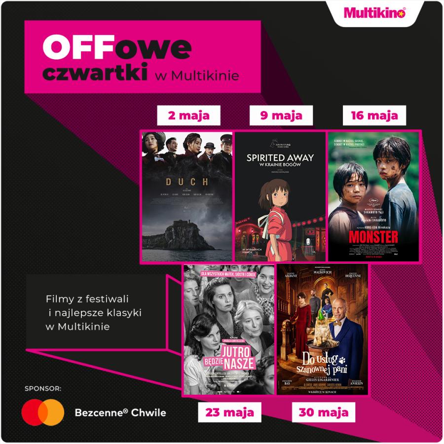Projekt „OFFowe czwartki” w maju rozszerzy regularny repertuar o filmy festiwalowe i artystyczne produkcje. 2 maja widzowie będą mogli zobaczyć „Ducha", 9 maja „Spirited Away: W krainie bogów”, 16 maja „Monster”, 23 maja „Jutro będzie nasze”, a 30 maja „Do usług szanownej Pani”.