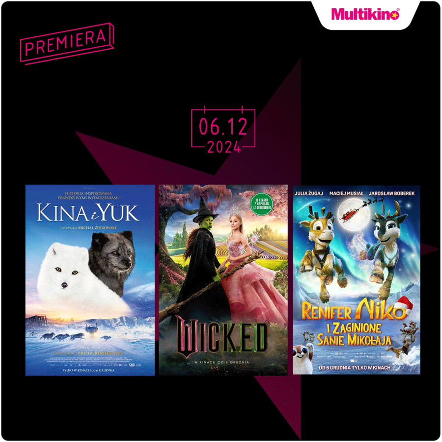 Od 6 grudnia widzowie mogą oglądać w Multikinie„Wicked” - film, który powstał na bazie broadwayowskiego przeboju bijącego rekordy popularności od debiutu w 2003 roku. To elektryzującą opowieść o wyjątkowej przyjaźni Elphaby (Złej Czarownicy z Zachodu) i Glindy (Dobrej Czarownicy). Obie bohaterki są studentkami Uniwersytetu Shiz w fantastycznej Krainie Oz i nawiązują głęboką przyjaźń. Jednak po spotkaniu z Czarodziejem z Krainy Oz ich przyjaźń stanie na rozdrożu, a życie obierze zupełnie inne ścieżki. Glinda, pragnie popularności, marzy o władzy, podczas gdy Elphaba pozostanie wierna sobie i tym, którzy ją otaczają. Jej postawa będzie miała jednak nieoczekiwane konsekwencje dla jej przyszłości. Niezwykłe przygody w krainie Oz sprawią, że ostatecznie wypełnią swoje przeznaczenie jako Dobra Czarownica i Zła Czarownica z Zachodu. W filmie widzowie zobaczą jako Elphabę: Cynthię Erivo, zdobywczynię nagród: Emmy, Grammy i Tony. W roli Glindy występuje zdobywczyni nagrody Grammy, supergwiazda Ariana Grande. Tego samego dnia do kin wejdą jeszcze dwie produkcje familijne: animacja „Renifer Niko i zaginione sanie Mikołaja” oraz film „Kina i Yuk”.