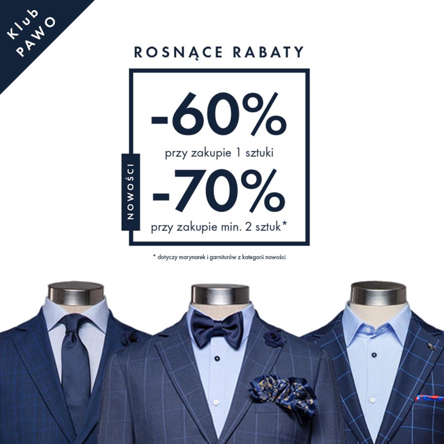Wybierz 1 sztukę - garnitur lub marynarkę i zapłać 60% mniej, lub wybierz 2 sztuki i zapłać aż 70% mniej!