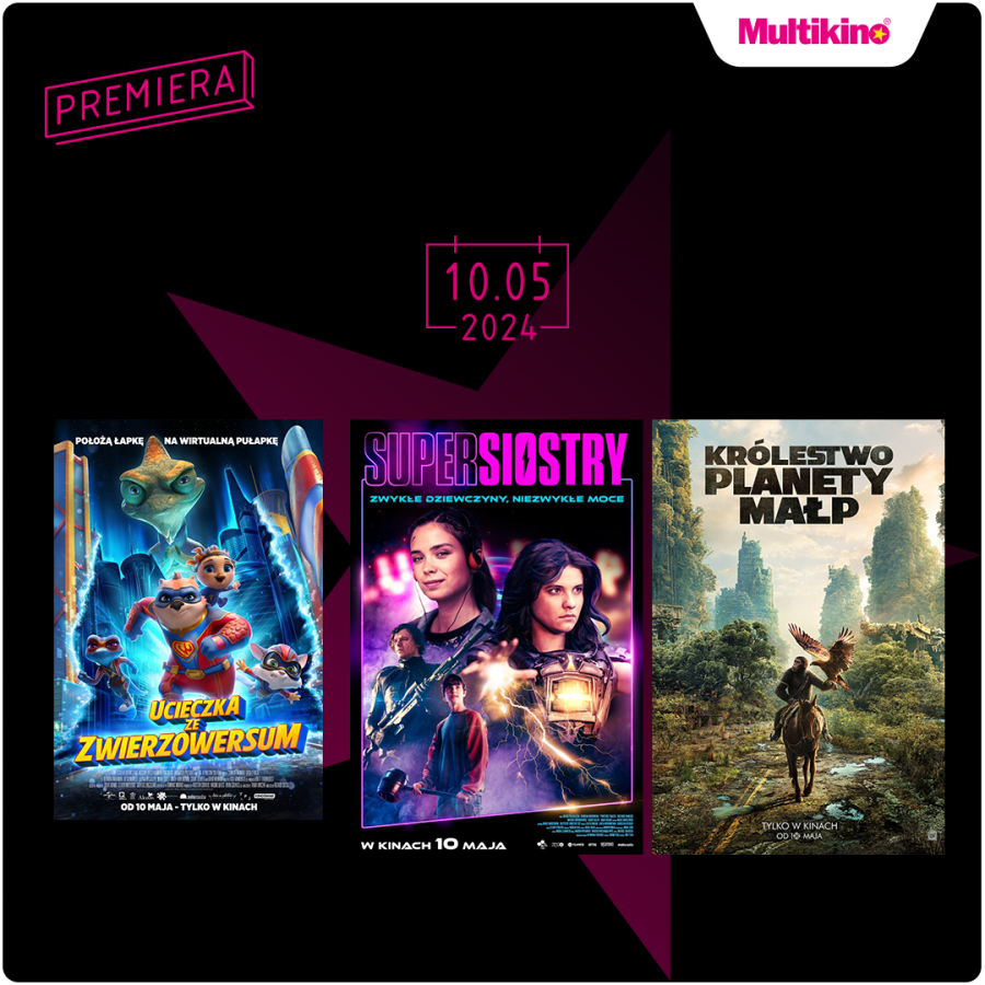 Od 10 maja w kinach sieci Multikino premierowo będzie można zobaczyć: „Królestwo planety małp”, „Supersiostry” oraz animację „Ucieczka ze zwierzowersum”. Ponadto 11 i 12 maja odbędą się przedpremierowe pokazy filmu familijnego „Istoty fantastyczne”. Bilety są dostępne w kasach kin sieci Multikino, na www.multikino.pl oraz w aplikacji mobilnej.